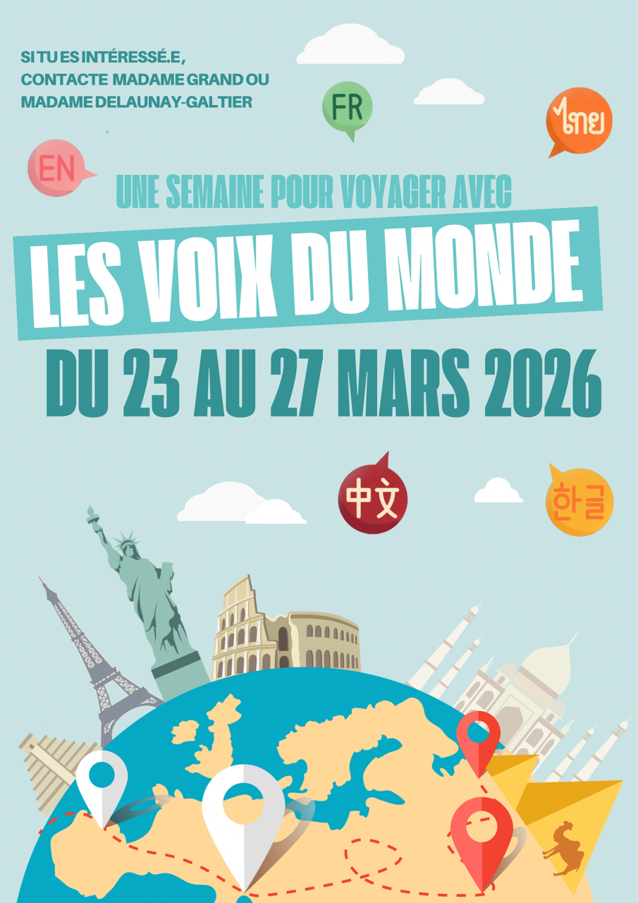 Les Voix du Monde du 17 au 21 mars C’est le retour des Voix du Monde ! A l’occasion de la Semaine des Langues, les élèves, mais aussi des adultes de l’établissement, vont vous rendre visite dans vos classes pour vous faire entendre les langues (...)
